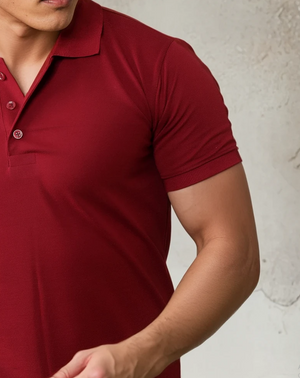 - Maroon solid Polo T Shirts, has a polo collar, and short sleeves