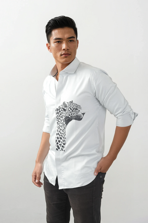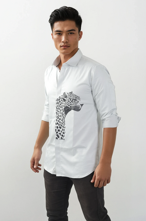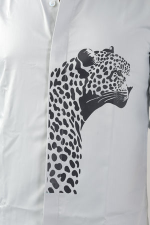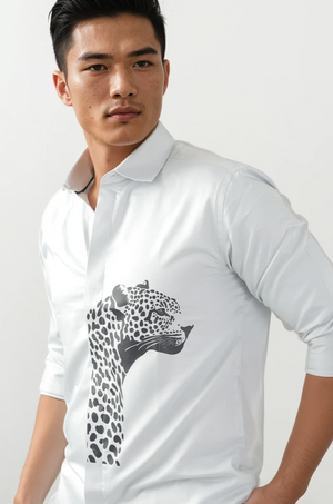 What sets it apart is the striking leopard graphic print on the frontāa symbol of strength, style, and individuality. The design adds a modern twist to a classic white shirt, making it versatile enough to take you from casual outings to after-hours events with ease.