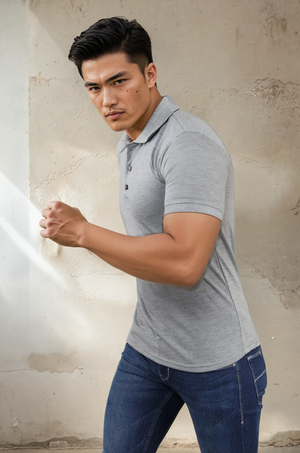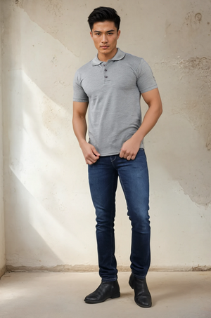 - Grey solid T-shirt, has a polo collar, and short sleeves