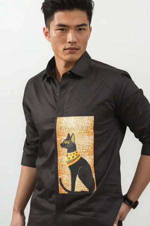 Step into timeless elegance with the Noir Bastet Heritage Shirt ā where modern tailoring meets ancient mystique. Crafted in deep black cotton with a flawless slim cut, this piece is elevated by a striking Bastet artwork panel inspired by Egyptian royalty, hand-finished with golden tones that evoke power and sophistication.