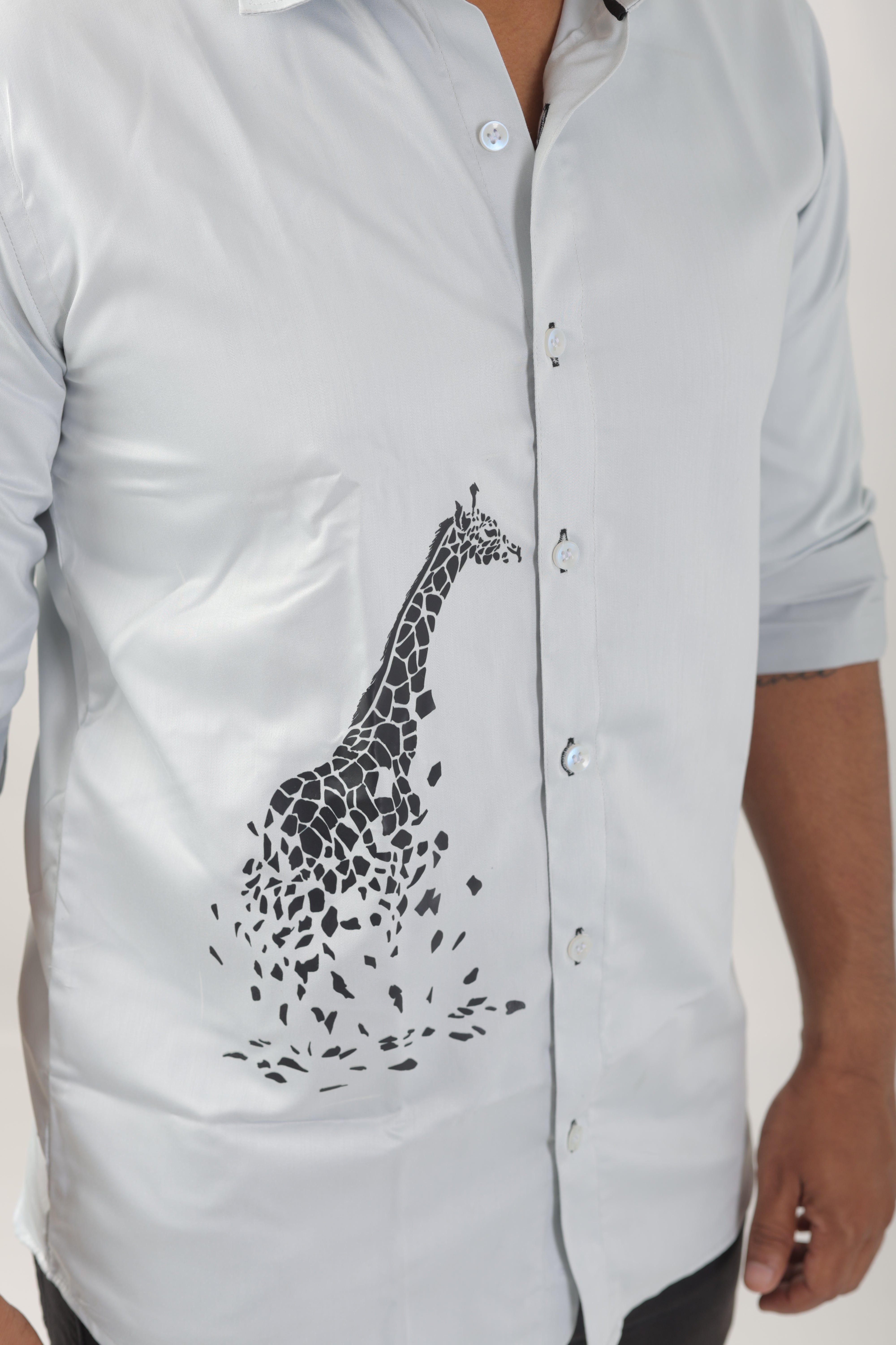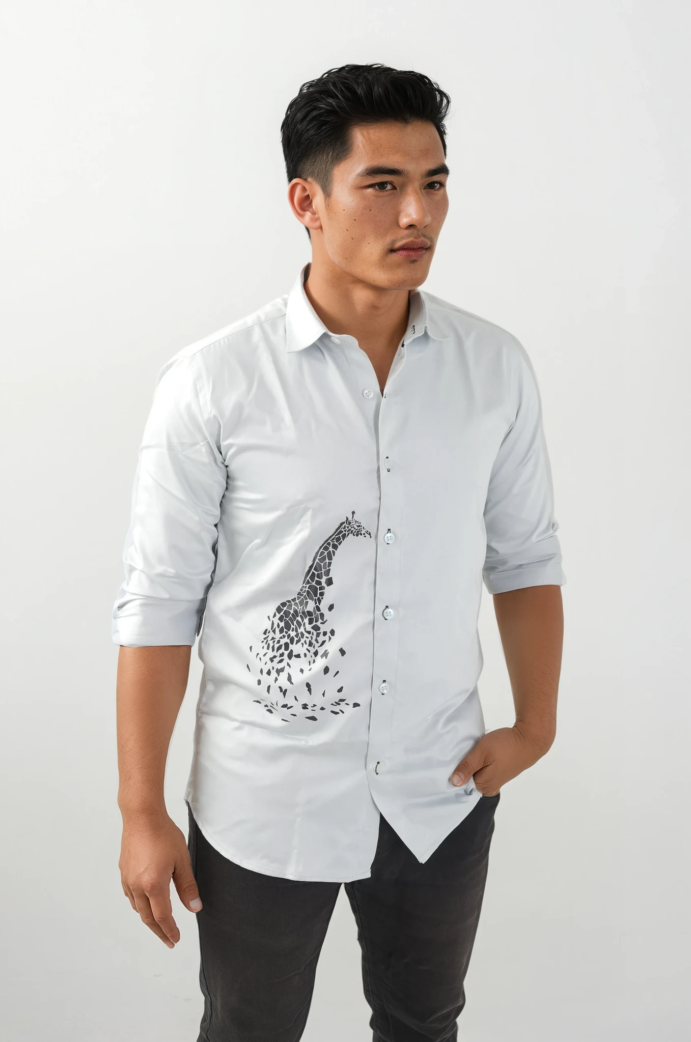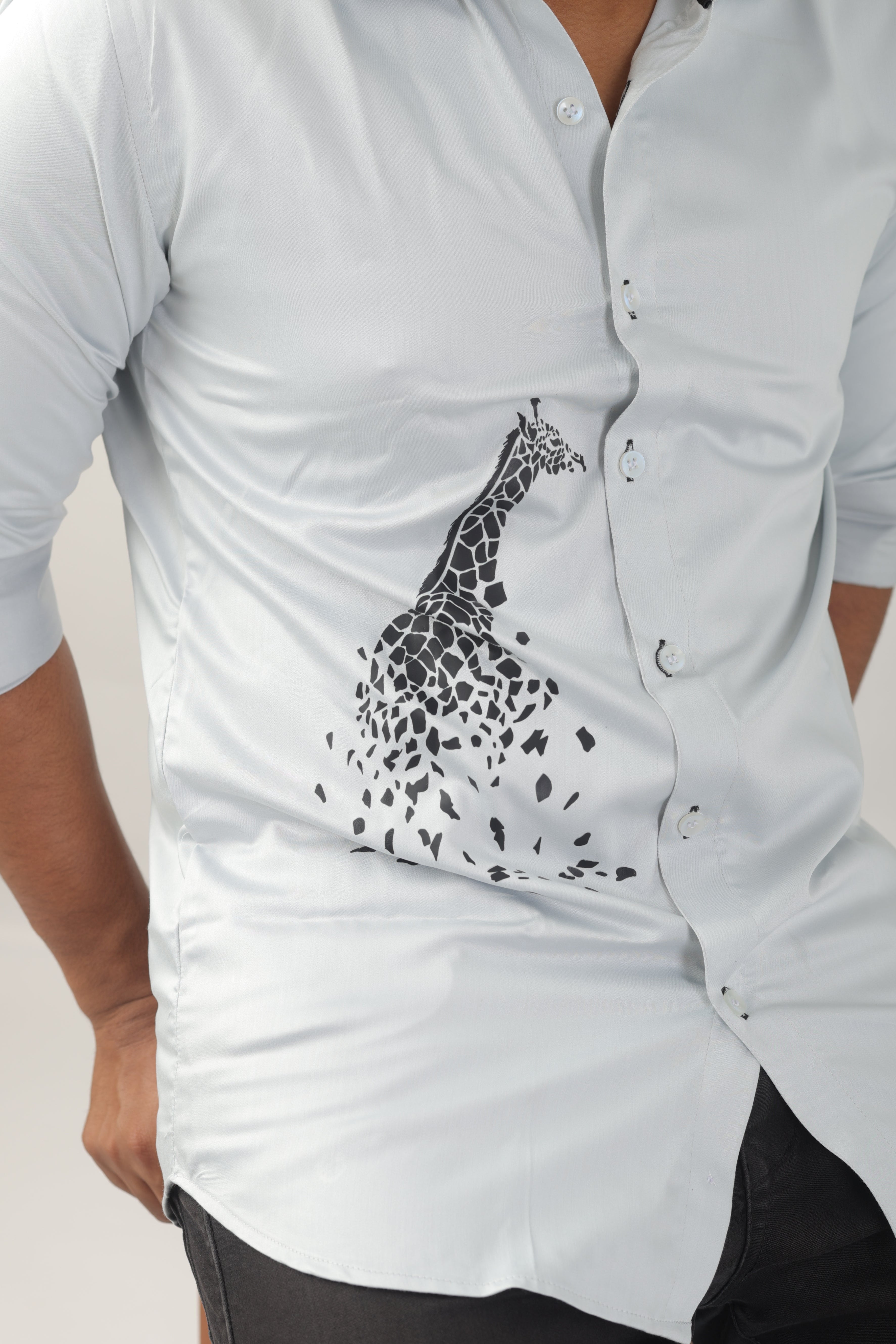Crafted in a light, crisp shade of cool gray, the shirt serves as the ideal canvas for its captivating giraffe graphic. The design is a masterpiece of contemporary flair: a stately giraffe silhouette that gracefully disperses into a flurry of stylized geometric fragments towards the hem. This fading effect creates a dynamic, high-fashion statement that is effortlessly cool.
