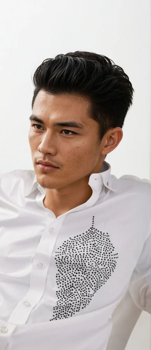 Pair this statement shirt with tailored black trousers, dark denim (as pictured), or a sharp suit for an elevated ensemble. The 'Nocturne Quill' is not just a shirtāitās a definitive expression of modern elegance.