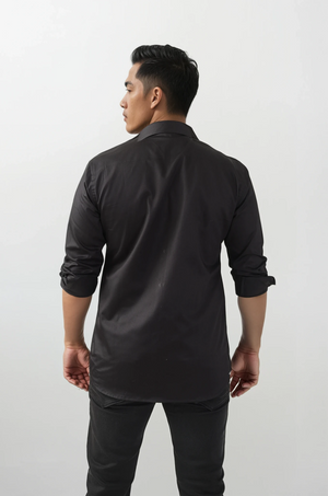 Crafted from a luxurious, smooth satin fabric in a deep, timeless black, this shirt drapes impeccably, offering a sleek silhouette that feels as good as it looks. The fabric's subtle sheen elevates the look, ensuring you maintain an air of understated elegance.