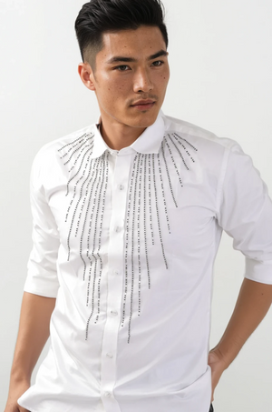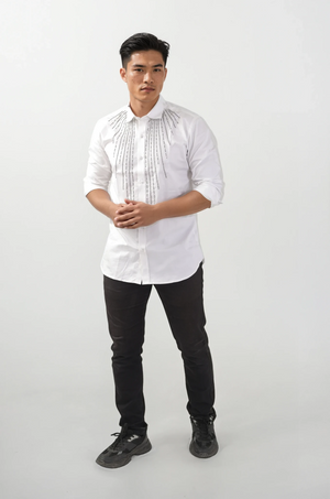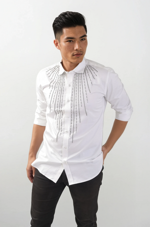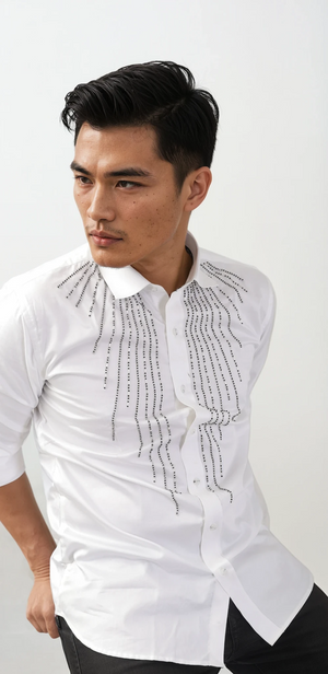 Sophistication in Detail: Crafted from a crisp, high-quality white fabric, this slim-fit shirt features a bespoke, hand-applied black beadwork design. The elegant pattern simulates a mesmerizing, cascading "drip" effect that flows down from the shoulders and collar line, creating a unique and modern textural contrast against the pristine white background. Each bead is meticulously placed by hand, ensuring a one-of-a-kind garment with impeccable attention to detail.
