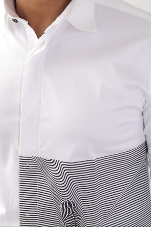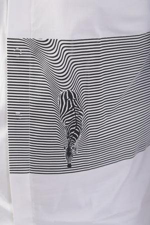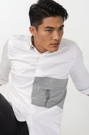 Crafted from a premium, crisp white fabric, the shirtās clean, sophisticated structure is dramatically interrupted by a bold, black-and-white optical illusion graphic. The design features fluid, kinetic lines that create a mesmerizing sense of depth and movement, guaranteed to turn heads and spark conversation.